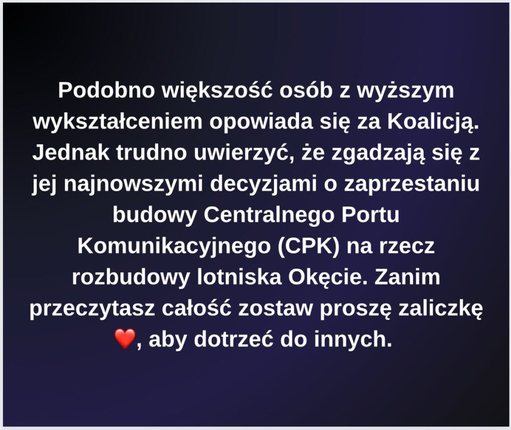 ci ludzie z wyższym wykształceniem będący wciąż za obecną władzą, być może nie znają tych faktów. Czerpią wiedzę ze źródeł prorządowych, które podają im odpowiedni przekaz, quasi-ekspertów, którzy tłumaczą, że lepiej wydać 2 mld na Okęcie i latać jeszcze 10 lat, zamiast 40 mld na CPK. Mniej więcej tak to podała ostatnio Wyborcza. Szkoda, że nie korzystają ze swojej inteligencji, by dywersyfikować źródła wiedzy, moze po prostu nie mają na to czasu. Niestety ale brak wiedzy to główny problem, ludzie głosują za przekazem, partią, narracją, a nie za solidną źródłową wiedzą. Dlatego sporo dobrego mogą zrobić takie portale, jak kanał Zero, który rozbija bańkę. I oby takich apolitycznych źródeł było więcej, Polska potrzebuje mądrzejszych wyborców