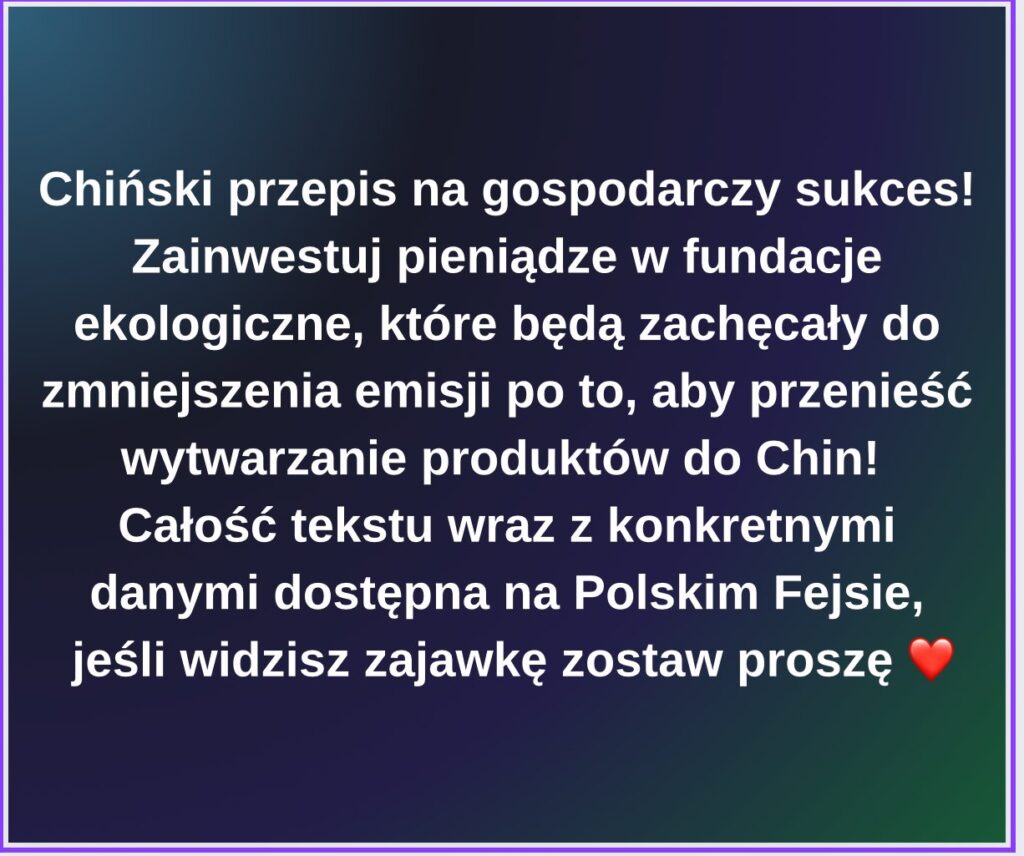 Chiński przepis na gospodarczy sukces! Zainwestuj pieniądze w fundacje ekologiczne, które będą zachęcały do zmniejszenia emisji po to, aby przenieść wytwarzanie produktów do Chin! Energy Foundation, międzynarodowa organizacja non-profit zajmująca się ochroną klimatu z oddziałem w Pekinie, w ubiegłym roku przekazała...