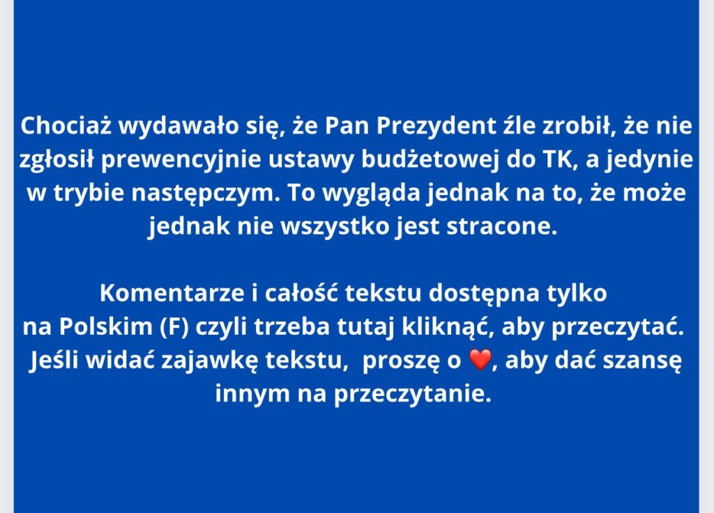 @eljot60 Janie ale Prezydent nie będzie miał wyjścia, jeśli TK stwierdzi, że nie podpisał ustawy budżetowej, bo taka nie wpłynęła do Niego. To już wynika wprost z Konstytucji. Nie ma możliwości prawnej, aby po takim wyroku nie było skrócenia kadencji Sejmu, no chyba, że Prezydent chciałby złamać Konstytucję.