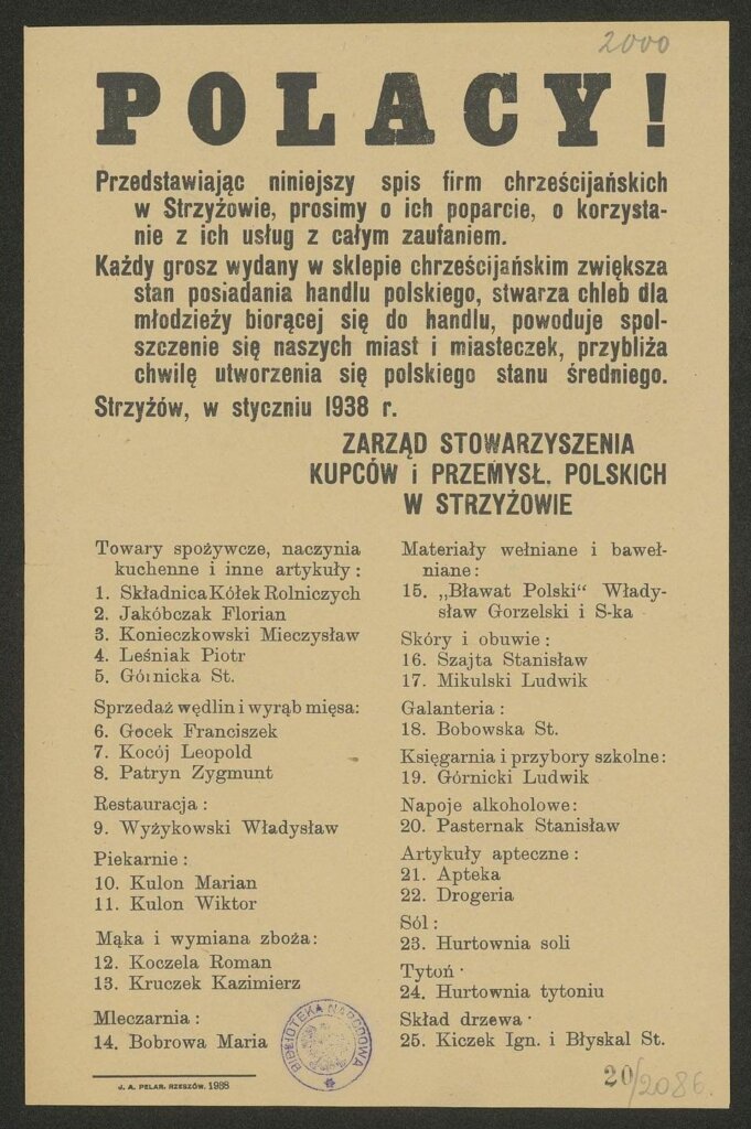 patriotyzm gospodarczy z 1938 roku 🙂 a tak swoją drogą, ciekawe, ile dziś jest w Strzyżowie polskich firm i czy dziś Polacy też starają się korzystać z usług polskich przedsiębiorstw (np. sięgając po artykuły w sklepie)?