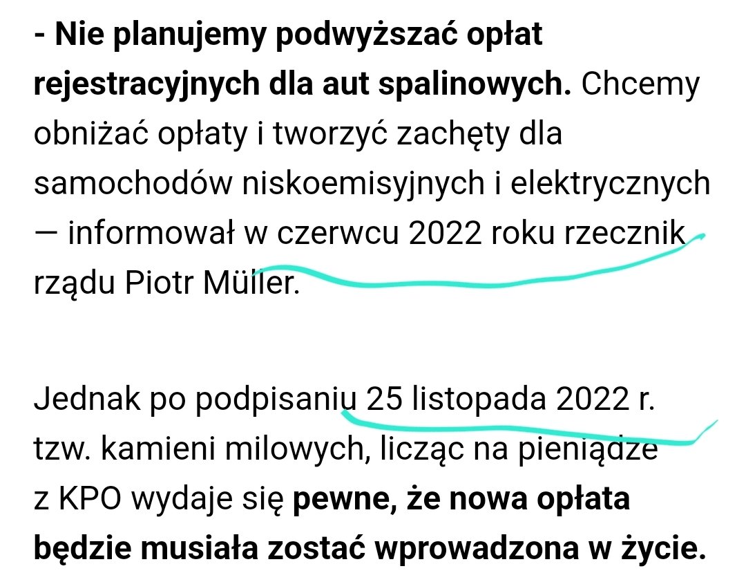 @chicku Jesteś pewny, że podpisali, czy tylko tak myślisz? Podpisali wiele kamieni milowych, jedne zrealizowali a innych nie. Myślę, że PiS tego kamienia milowego nie miało zamiaru realizować, a przynajmniej nie poprzez wprowadzenie opłaty od posiadania samochodu spalinowego.