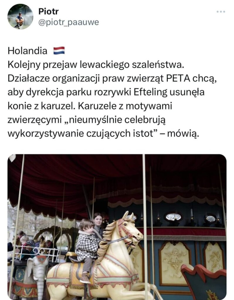 Idiotom w d. Się poprzewracało.dopoki mają jedzenie na półkach sklepowych albo serwowane w restauracjach to mogą sobie głosić swoje farmazony o wykorzystywaniu zwierząt, gdyby przyszło im musieć przetrwać w bojowych warunkach ciekawe co by zrobili… czy jazda konna jest wykorzystywaniem zwierzęcia? Dlaczego się zabrali za karuzele a nie np za jeź…Zobacz więcej