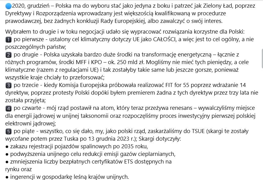 Morawiecki: – Jedno nie ulega wątpliwości – ani ja, ani rząd Prawa i Sprawiedliwości nigdy nie zgodziliśmy się na zapisy Zielonego Ładu w kształcie i interpretacji, które teraz forsuje posłuszny wobec Brukseli rząd KO. Każdy, kto twierdzi inaczej – nie ma po prostu pojęcia o tym, jak działa Unia Europejska i jej instytucje. Co więcej – prot…Zobacz więcej