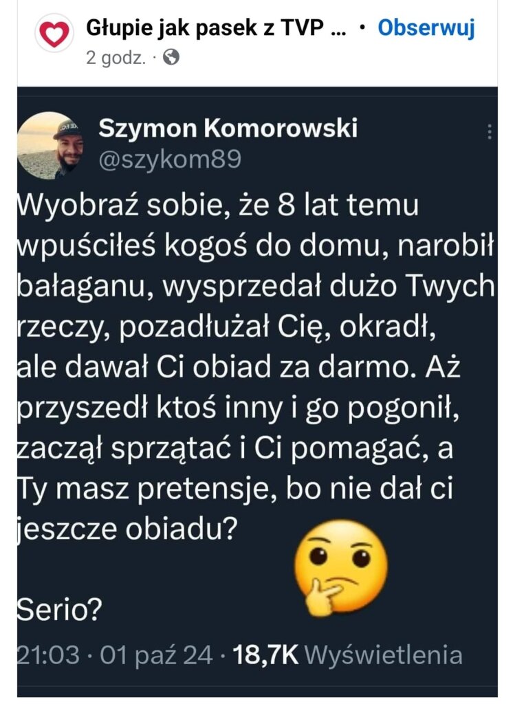@chicku Szczerze mnie to przeraża, jak bardzo ci ludzie są bezmyślni i jak przez to niebezpieczni. . Ja pamiętam o ile spokojniej, łatwiej, mi się zaczęło żyć jak wszedł PiS. Owszem druga kadencja to już nie było to samo ale pierwsze 4 lata super, jedyny zamęt z tamtych lat to beznadziejna, bojówkarska opozycja.