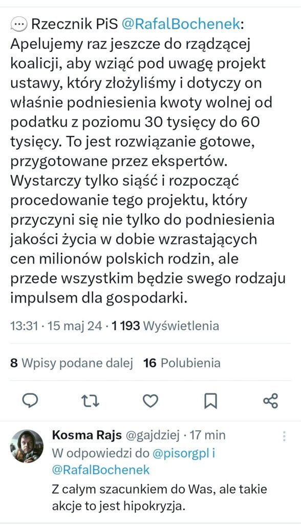 @chicku Owszem gierki, ale przypominam, że Konfederacja jako pierwszy projekt złożyła to samo i wpadło do zamrażarki i komisji. Zatem PiS robi to samo co Konfa – mówi: dajcie Polakom program 60 (kwoty wolnej), który sami obiecaliście. W polityce tego rodzaju przypominki są skuteczne.