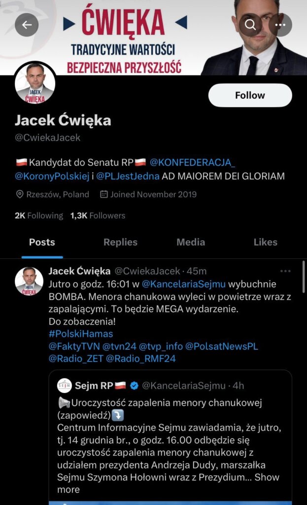 @joanna ustawka – chodzi Ci o akcję z gaśnicą? – wiesz, mogła być ale nie musiała, ponoć wcześniej Braun miał płomienne przemówienie, którym wprawił w zdumienie nawet Tuska, a więc spory sukces Konfederacji i – być może na fali tej adrenaliny złapał gaśnicę i zrobił taki numer. Bo jednak po takim publicznym wystąpieniu człowiek nie zawsze myśli do końca racjonalnie. Z kolei jeśli to była zaplanowana akcja, dla mnie to nic nie zmienia, choć przy spontanie łatwiej byłoby go tłumaczyć, szczególnie, gdyby potem stwierdził jeszcze, że rzeczywiście przesadził, bo dało się to załatwić inaczej (ale chyba nic takiego nie powiedział). Co do akcji z bombą, pokazuje, że środowisko Brauna jest rzeczywiście podejrzane i Konfederacja powinna się od nich odciąć. Biorąc pod uwagę działalność Brauna (także tę w roli reżysera), aż trudno powiedzieć, że jest ruskim agentem. Gdyby był gościem, który wypłynął dopiero niedawno, miałbym większe przekonanie, bo naprawdę jego działalnosć jest mocno szkodliwa dla sprawy polskiej. Jeśli menora w Sejmie to akcja od Chadad Lubawicza, warto kwestionować ten zwyczaj, ale nie tak. W ten sposób Braun tylko go prawdopodobnie zabetonował i teraz mamy pewność, że menora będzie co roku. Samo święto jako takie nie ma dla mnie nic podejrzanego, przynajmniej na podstawie tego, co poczytałem. Jedynie sytuacja, jeśli jest wykorzystywane do pozyskania politycznych wpływów przez Chadad Lubawicz (mówi o tym młody Żyd, czy @radek w ostatnich wpisach).