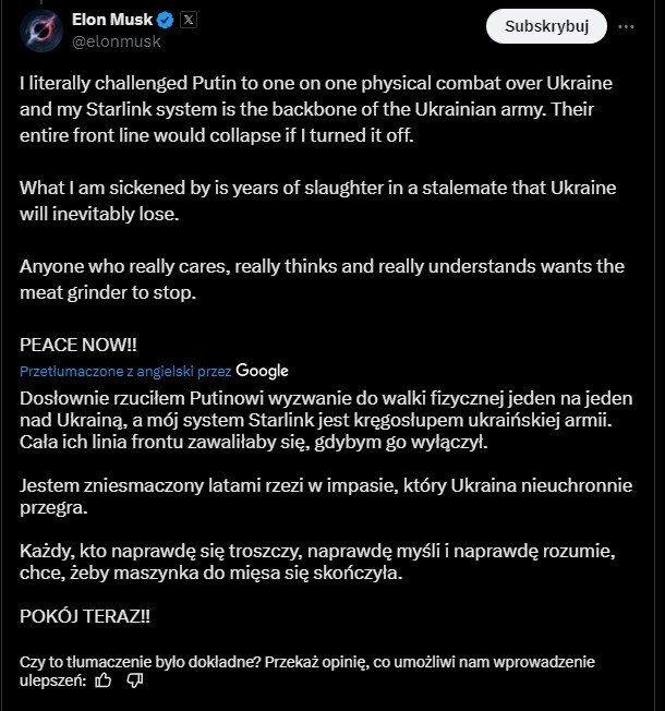 Sekretarz stanu USA Marco Rubio odniósł się do słów szefa polskiego MSZ Radosława Sikorskiego, dotyczących systemów Starlink w Ukrainie. Amerykański dyplomata podkreślił, że nigdy nie było mowy o ich wyłączeniu, a zamiast krytyki powinien podziękować Stanom Zjednoczonym. Rubio zaznaczył, że bez wsparcia USA Ukraina już dawno przegrałaby wojnę, a rosyjskie wojska mogłyby dziś stać na granicy z Polską. Do dyskusji włączył się również Elon Musk.