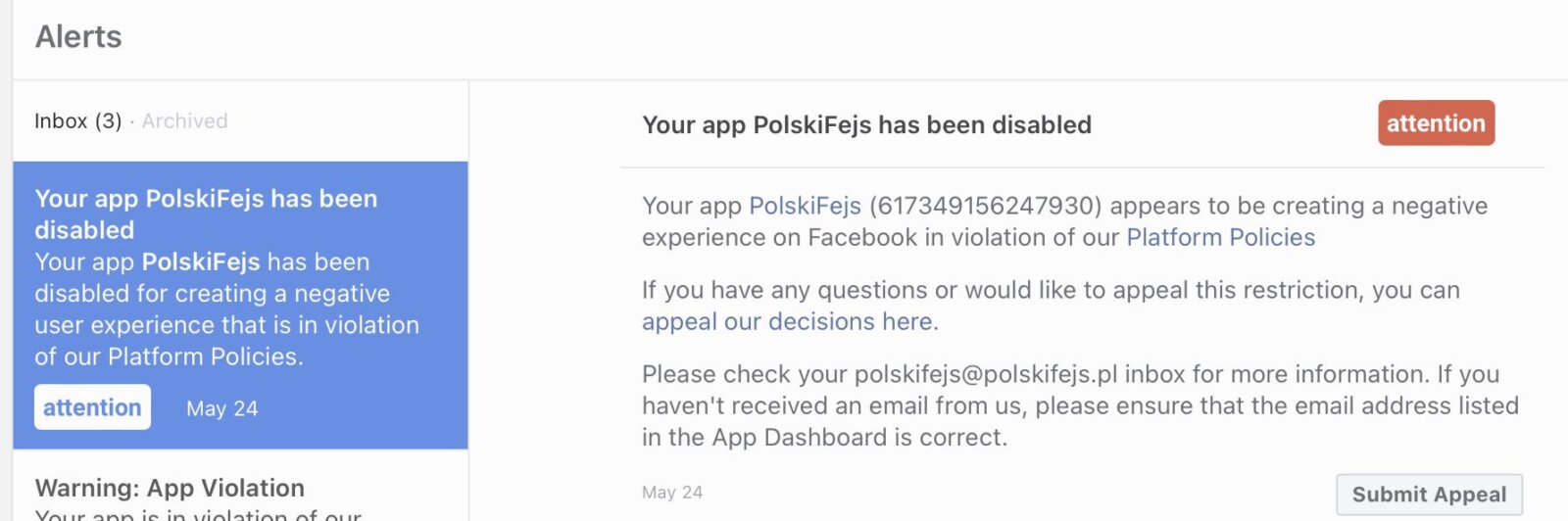 „Wygląda na to, że Twoja aplikacja PolskiFejs powoduje negatywne wrażenia na Facebooku, naruszając na…Zobacz więcej12 Komentarzy-