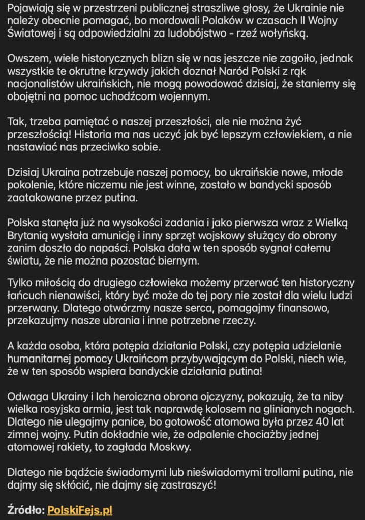 Dziś bohaterski naród Ukrainy walcząc w obronie swojej Ojczyzny walczy także o nasze bezpieczeństwo. Pomagając Ukrainie pomagamy także sobie, swoim rodzinom, pomagamy Polsce, bo dzięki istnieniu wolnej Ukrainy możemy czuć się bezpieczniejsi.