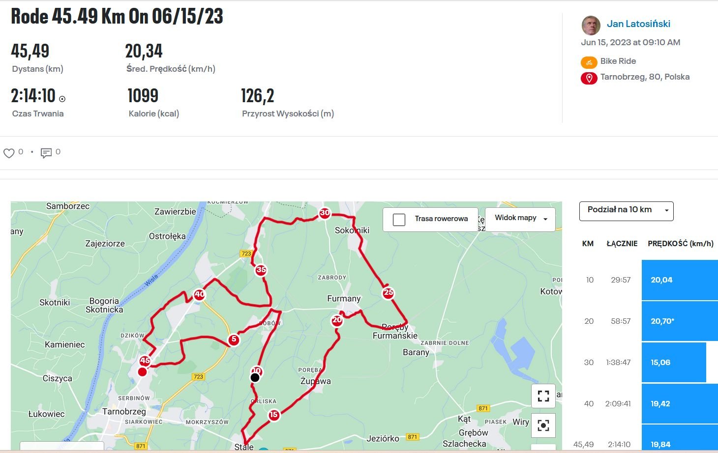Odpoczywam, bo jestem po przejechaniu 45,5 km. Zdjęć nie robiłem a trasę dzisiejszej rowerowej przejażdżki załączam poniżej.