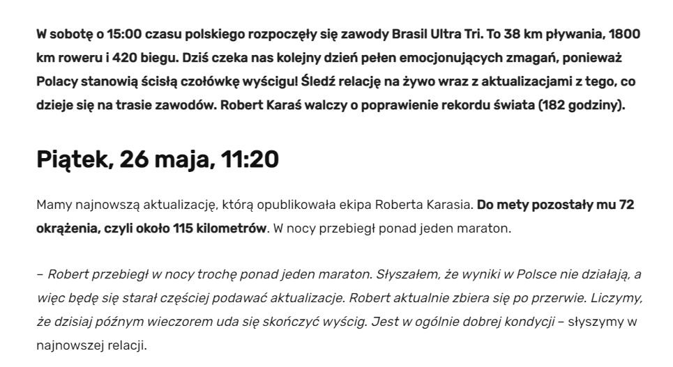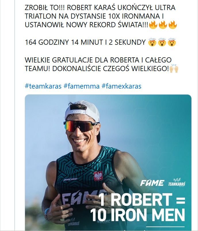 Robert Karaś nowym rekordzistą świata na dystansie 10x Ironman. Zawodnik pokonał dystans 38 km pływania, 1800 km roweru i 420 biegu w ok. 164 godziny!* Oznacza to, że poprzedni rekord (182 godziny) pobił o blisko 20 godzin!