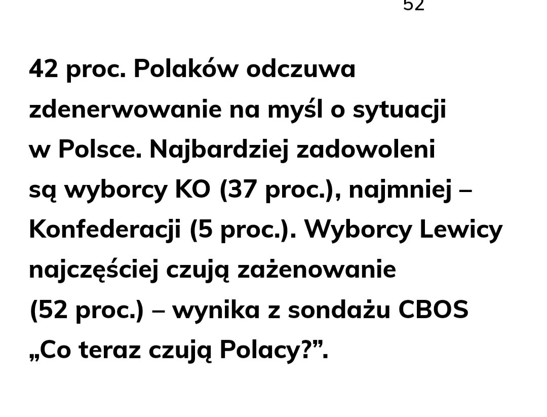@chicku tak to rozumiem też- 37 procent spośród wyborców KO (tych ankietownych) było pozytywnie nastawionych do tego co się dzieje zatem wychodziłoby na to że 63% spośród ich wyborców jest jednak niezadowolonych z obecnej sytuacji. ( chociaż dziwi mnie to w zalewie tych wysrywów ( sorki za wyrażenia ale naprawdę już nie mogę ) wybiórczej i innych tego typu i tych przyglupawych poślic