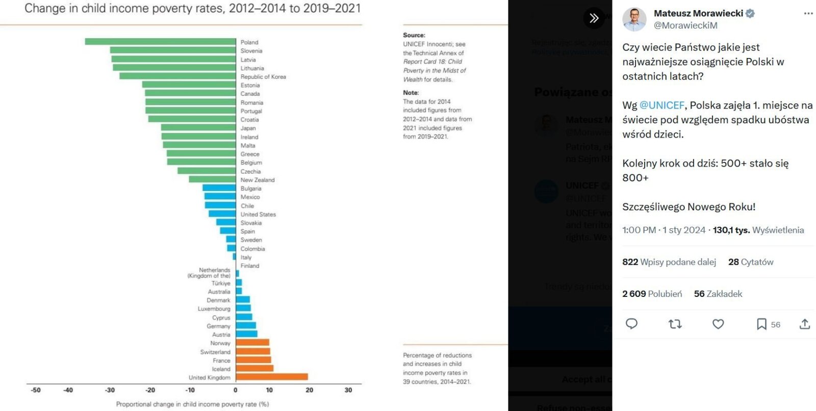 Wg UNICEF, Polska zajęła 1. miejsce na świecie pod względem spadku ubóstwa wśród dzieci.