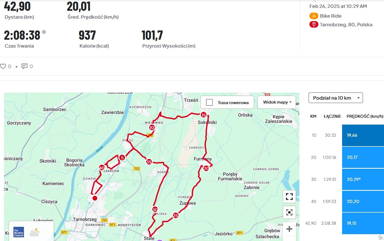 Dziś zdecydowałem się pokręcić się rowerem po okolicy Tarnobrzegu. Wykręciłem dystans maratonu.