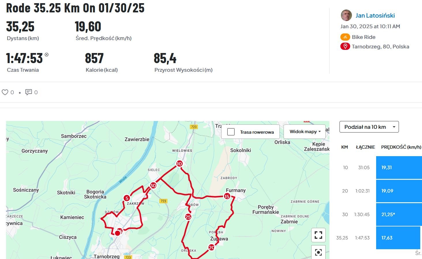 Wczoraj marsz a dziś jazda na rowerze. Systematycznie zwiększam dystans korzystając z dobrej pogody, sprawnego roweru i dobrego zdrowia.