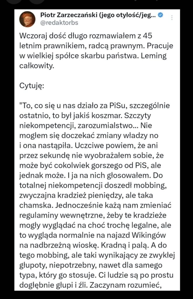 Powiem, że podziwiam pamięć pana Piotra Zarzeczańskiego, który z 45 minutowej rozmowy był w stanie zacytować kilka zdań swojego rozmówcy. Znalazłem końcówkę tej wypowiedzi, cytuję: