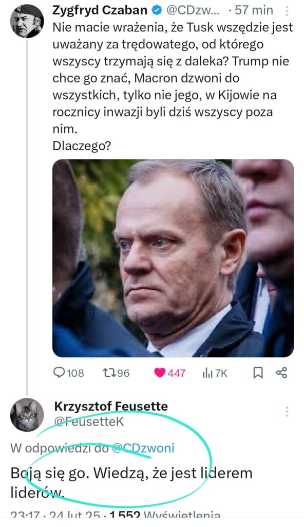@chicku Ale co miał na myśli Feusette pisząc, że Tusk jest „liderem liderów”? A Niemcy (nowy kanclerz) będą z nim rozmawiać, choć nie koniecznie oficjalnie, bo Tusk robi za nich i dla nich czarną robotę.