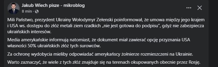 @chicku Rosja już na części terenów Ukrainy jest i nie zamierza się z nich wycofywać. Ale jeśli USA zmuszą Ukrainę do prawnego oddania tych terenów Rosji, to może Putin pójdzie na ten układ. Ukraina za pokój (raczej nietrwały) zapłaci nie tylko złożami USA ale także rezygnacją z okupowanych przez Rosję ich terenów.