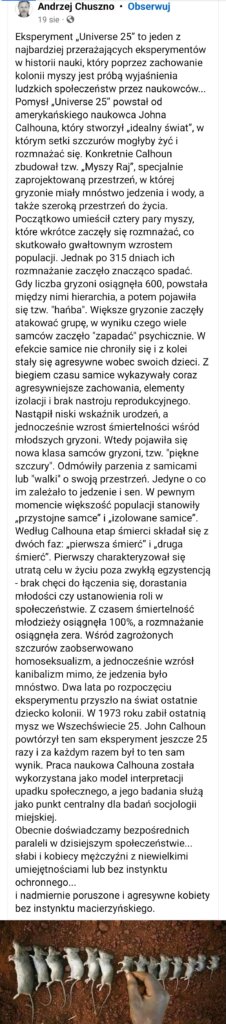 Jak to babcie mówiły: „Z dobrobytu im się w dupach poprzewracało” Człowiek to istota społeczna ale do właściwego rozwoju potrzebuje i przestrzeni i pewnych wyzwań. Większość z nas tej przestrzeni nie ma, siedzimy sobie na głowach jak szczury w klatkach, rozleniwiamy się pozornym dobrobytem. Płacimy większą cenę niż nam się zdaje, za naszą wsp…Zobacz więcej