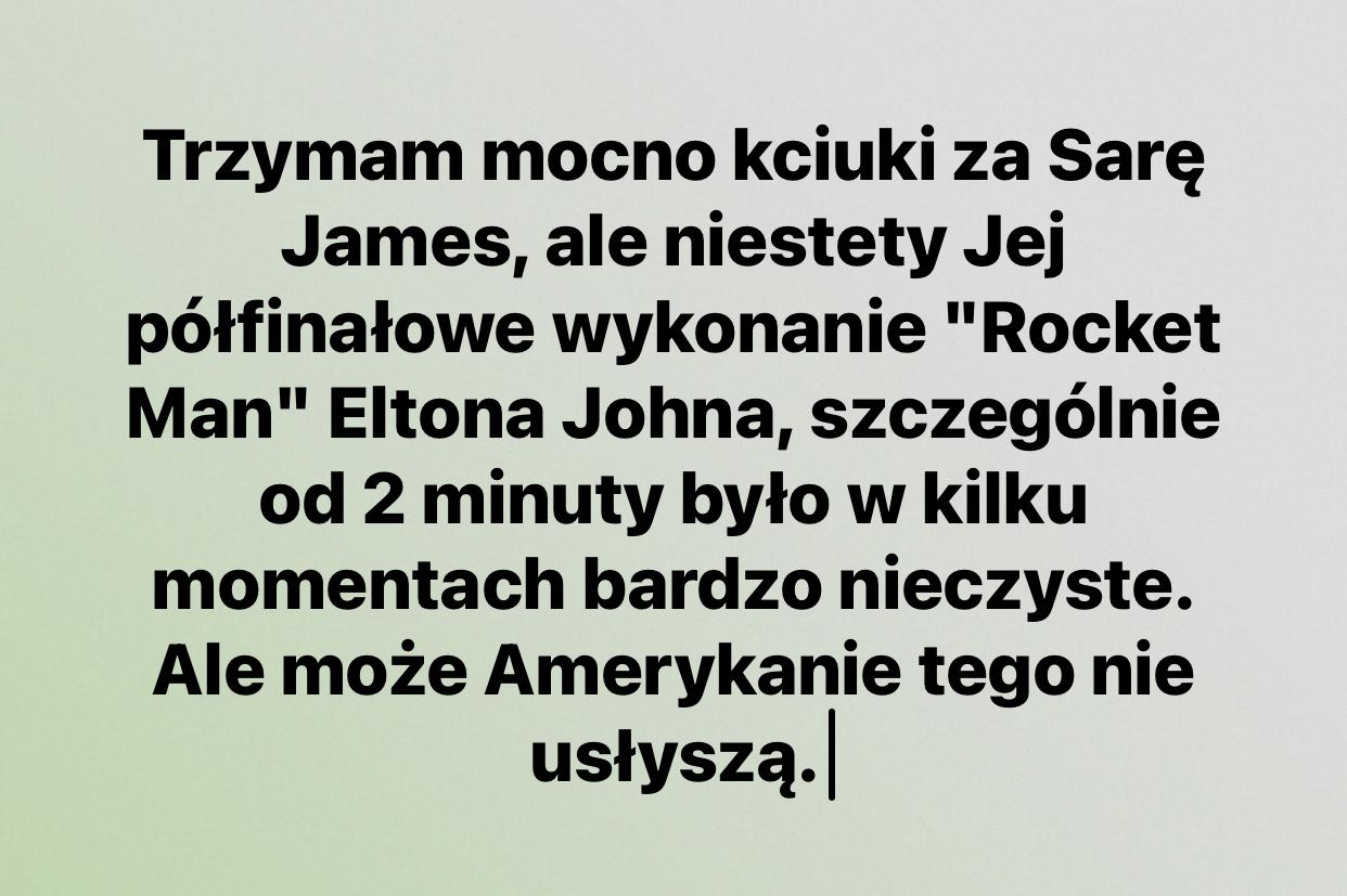 Trzymam mocno kciuki za Sarę James, przede wszystkim dlatego, bo jest utalentowaną Polką, ale niestety Jej półfinałowe wykonanie „Rocket Man” Eltona Johna, szczególnie od 2 minuty było w kilku momentach bardzo nieczyste. 🙁