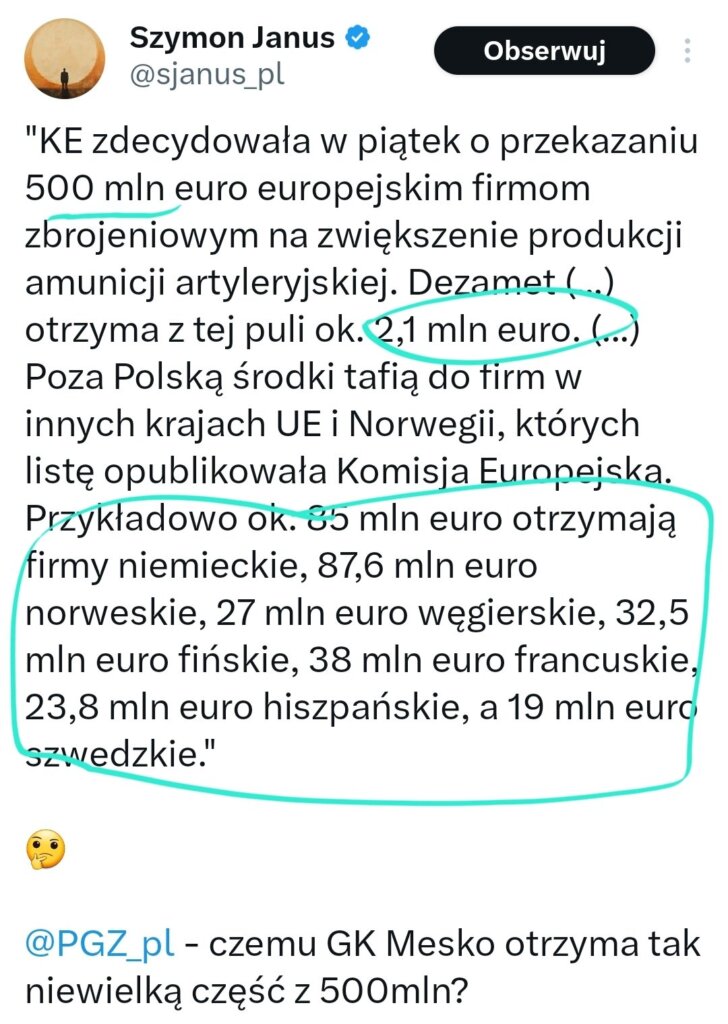 @koszalek ale to nie był zwrot za pomoc, tylko wsparcie na produkcję amunicji wypłacane na wniosek podmiotów z danego kraju (złożyliśmy wniosek na 11 mln, dostaliśmy 2,1 – też nie wiadomo dlaczego, co było we wniosku). Plus jest taki, że z budzetu RP zaplanowano na rozwój produkcji amunicji 2 mld zł, więc i tak firmy zbrojeniowe zostaną dokap…Zobacz więcej