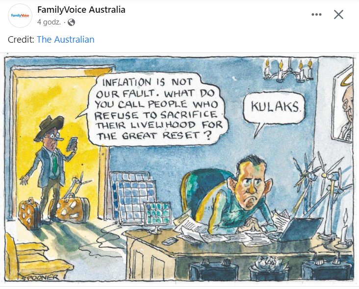Jak się okazuje podobne nastroje również i w Australii. Obrona rodziny, sprzeciw ideologii LGBT itd… Tutaj na obrazku minister finansów i premier Australii. „Inflacja to nie nasza wina. Jak nazywamy ludzi, którzy nie chcą poświęcić swojego statusu dla dobra wielkiego resetu? – Kułaki.”