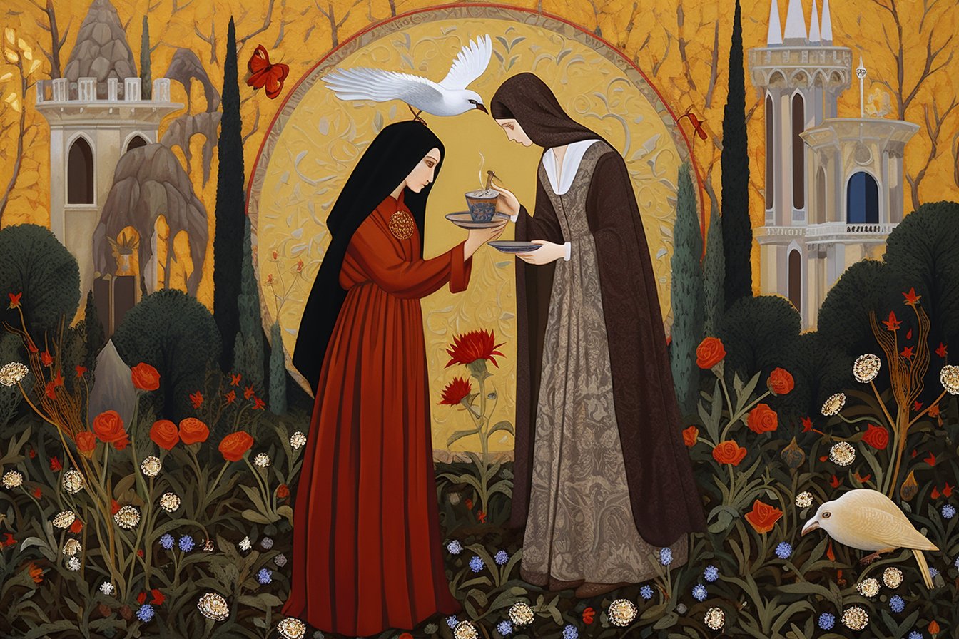 poprosiłem midjourney o wygenerowanie obrazu Nawiedzenie Elżbiety i wygenerował mi coś takiego… nawet mi sie podoba 😉