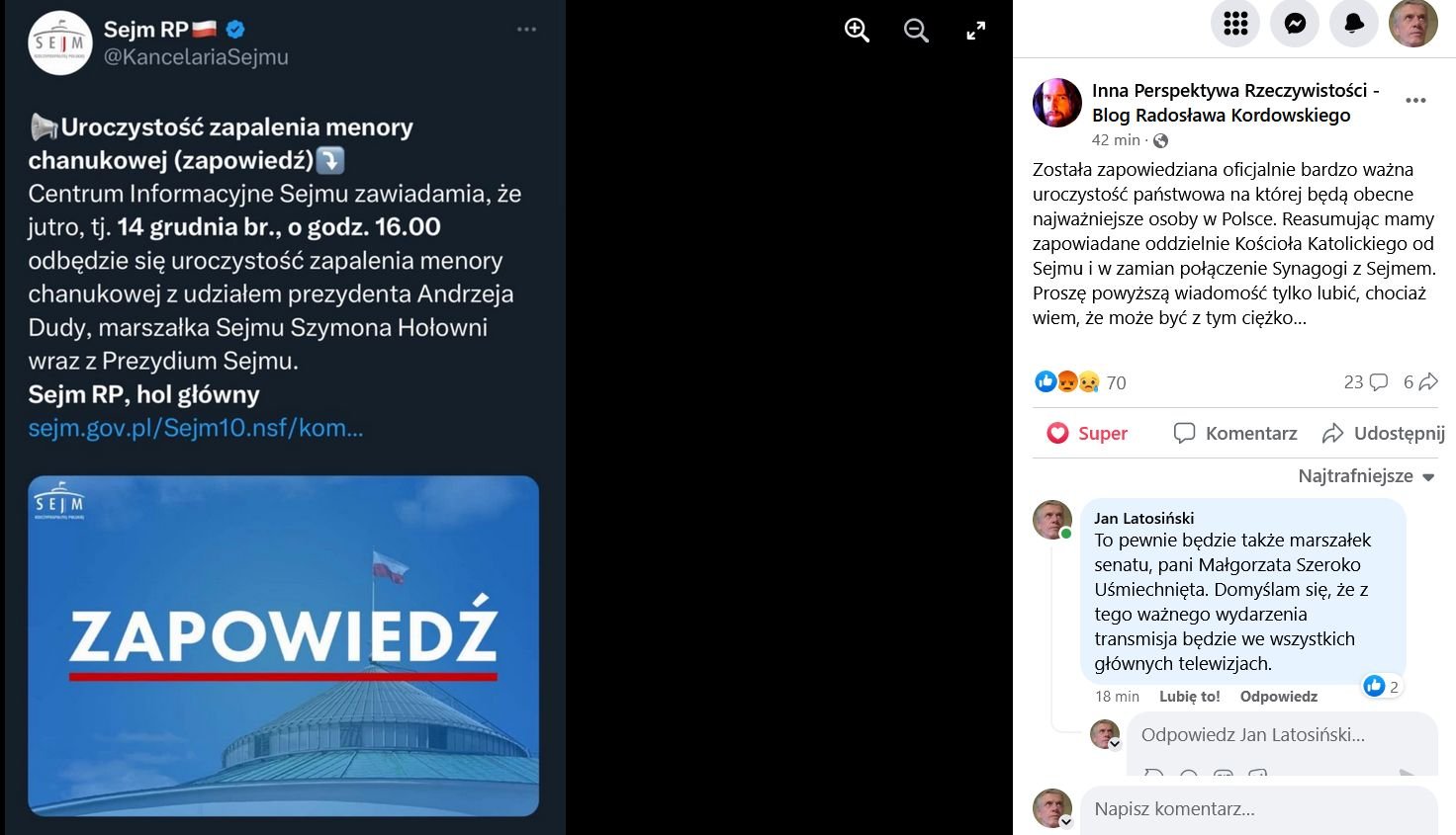 @chicku No właśnie o to chodzi, że każdy gada jak mu wygodnie. Raz to jest zakłócanie uroczystości religijnej, raz tylko historycznej. Jeżeli historycznej to jak najbardziej w Izraelu powinni obchodzić Chanukę tak jak my obchodzimy Dzień Niepodległości. Ewentualnie można taką uroczystość zorganizować w synagodze w Polsce czy w jakimś klubie żyd…Zobacz więcej