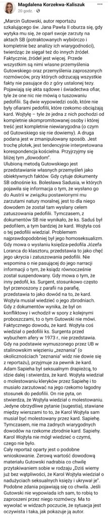 Autorka sporo pisze o sprawie na swoim profilu FB, demaskując metody dziennikarskie autorów filmu o JP2 emitowanego przez TVN