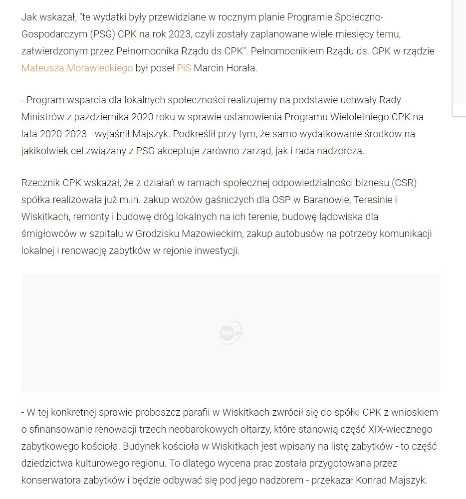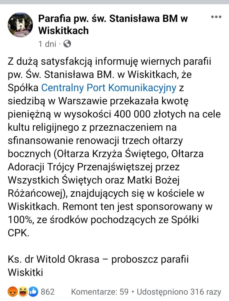 • @chicku ja w ogóle trochę nie rozumiem czemu proboszcz tej parafii zwrócił się z prośbą o finansowanie akurat do spółki CPK … jakby nie mógł np do ministerstwa kultury , tam mieli budżety na renowacje. Wiec może był jakiś powód dla którego tak zrobił? A może to w ramach jakiegoś zadośćuczynienia że np budowa tego portu jakoś narażała sam budynek kościoła czy coś? (Strzelam, nie wiem nawet gdzie te Wiskitki są 🙂 ) .