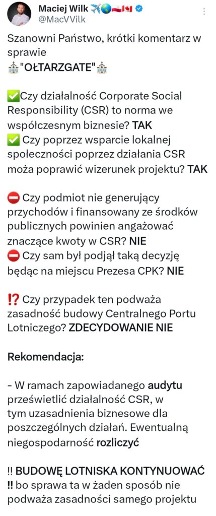 • @joanna bo to bardzo źle wygląda. CPK, który chce uchodzić za profesjonalny nowoczesny projekt, powinien kolportować bardzo techniczny przekaz, tymczasem okazuje się, że 400 tys. wydali na remont ołtarzy w kościele. Źle to brzmi (jakkolwiek zabytkom należy się opieka, ale naprawdę 99% ludzi nie zrozumie tego, że tą opieką zajmuje się akurat centralny port lotniczy). Założę się, że wspomną o tym wszystkie prorządowe media, które są nastawione anty. A raczej nie wspomną o tym, jak bardzo rozwojowy jest ten projekt. Po prostu ten komunikat to pożywka dla przeciwników CPK. Lepiej było wydać 1 mln na przygotowanie profesjonalnych raportów (i żeby taka informacja poszła w świat), niż 400 tys. na ołtrze w kościele (których zasadność renowacji skądinąd naprawdę rozumiem).